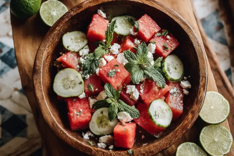 There’s something timeless about this watermelon and feta summer salad. It takes five everyday ingredients watermelon, feta, mint, cucumber, and lime and transforms them into a dish that looks elegant, tastes gourmet, and feels like summer in a bowl. I especially love serving it at potlucks or community events where everyone brings something from the heart.